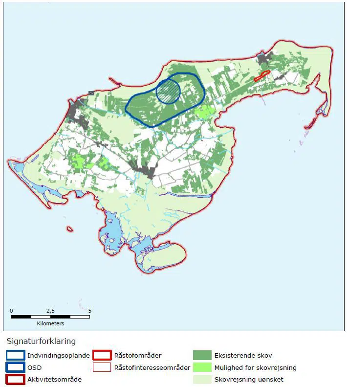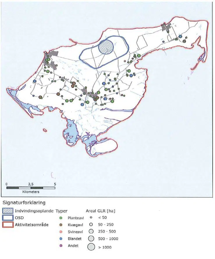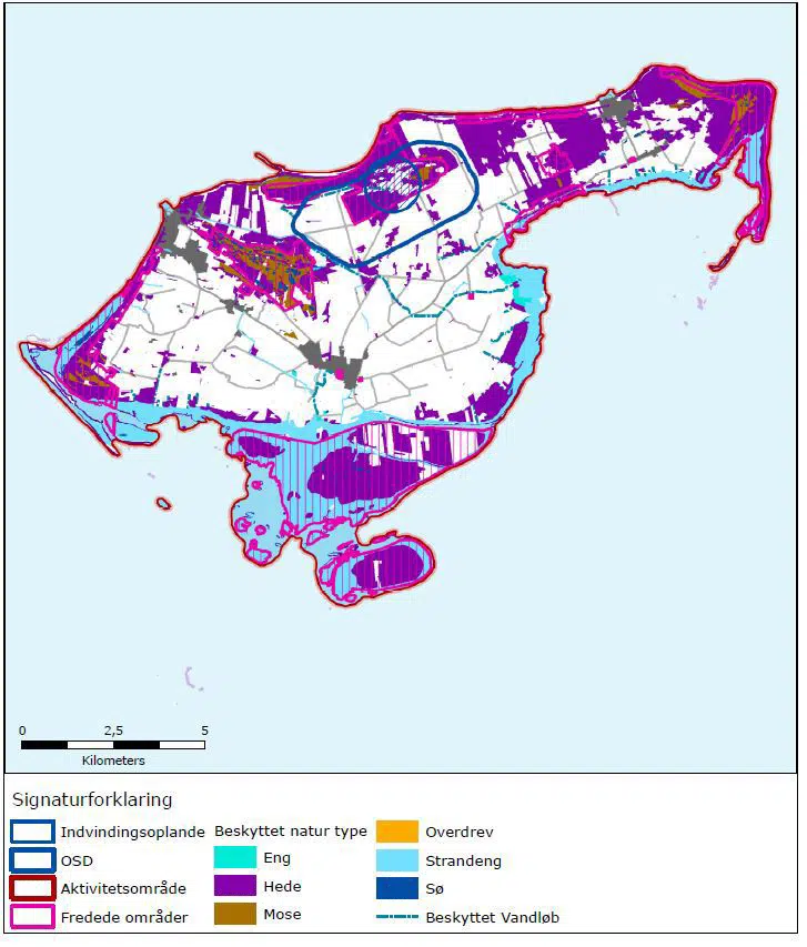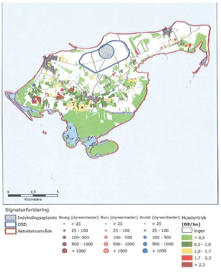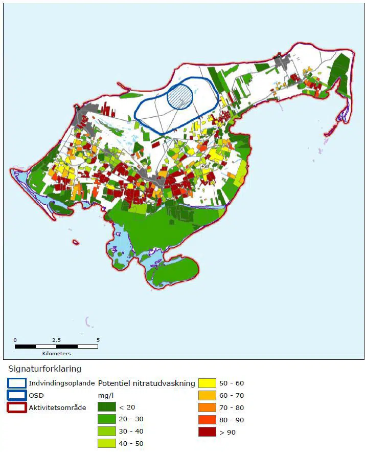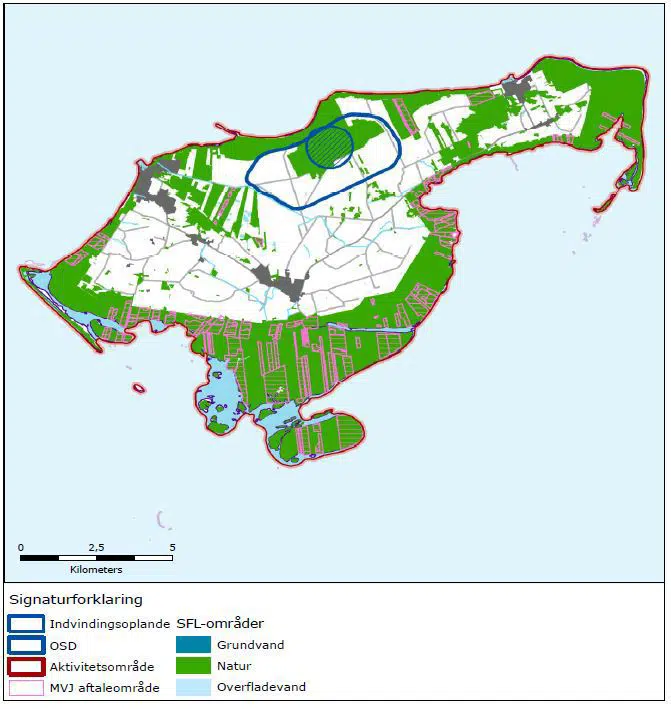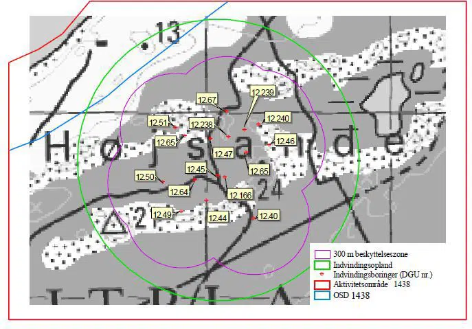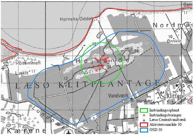 Det ses, at det cirkulære indvindingsopland mod nord strækker sig ganske lidt udover OSD grænsen, hvilket dog ikke har nogen praktisk betydning, da der udelukkende findes strand og klitter på dette areal.