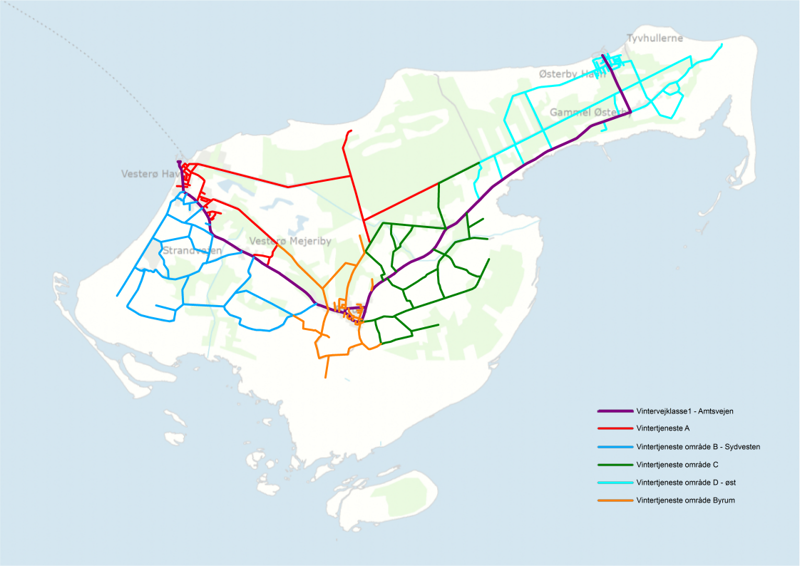 Læsø Kommunes vintertjeneste er inddelt i forskellige områder, som kan ses på kortet herunder.