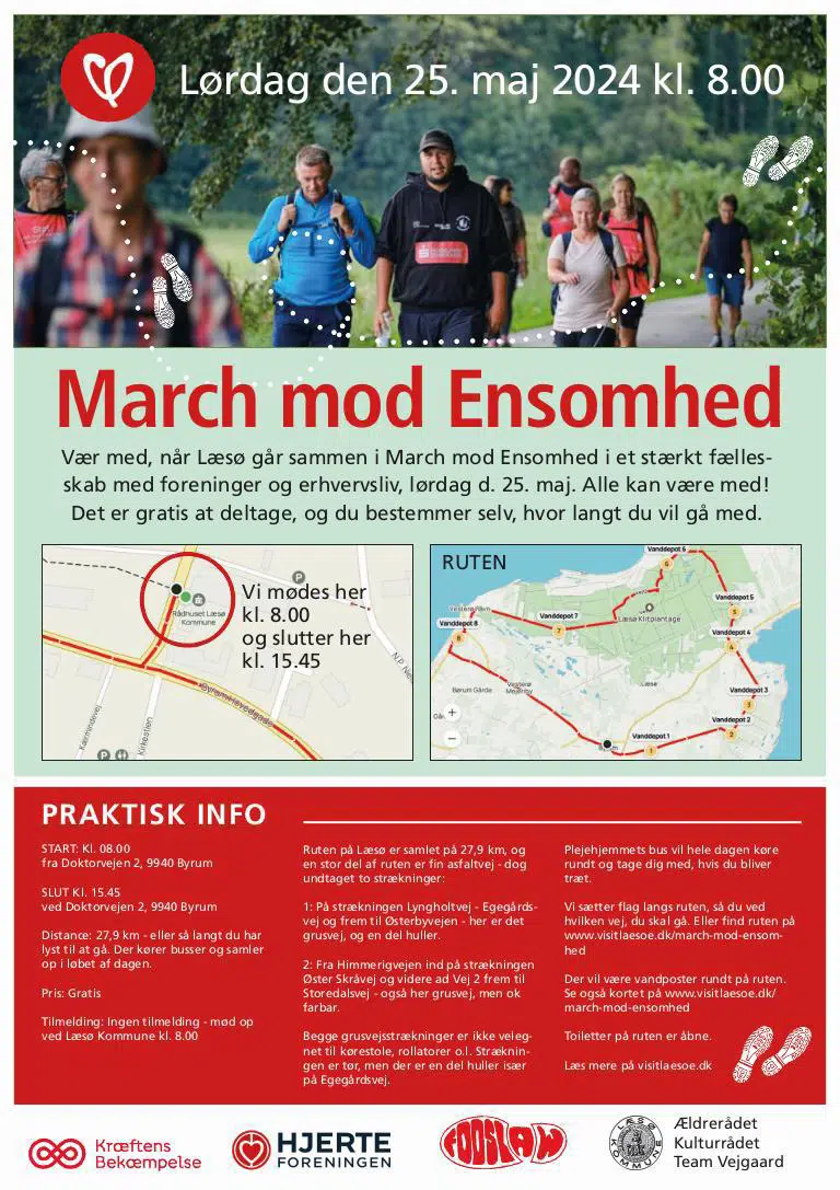 Plejehjemmets bus vil være til rådighed hele dagen og vil køre rundt for at bistå dig, hvis du bliver træt. Flag vil blive placeret langs ruten for at guide dig. Du kan også finde ruten på www.visitlaesoe.dk/march-mod-ensomhed.